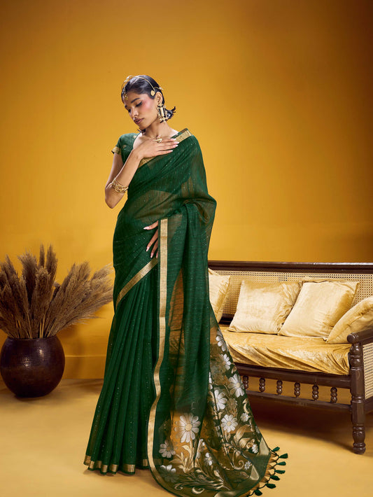 Dark Green Pure Khaddi Georgette Banarasi Silk Saree