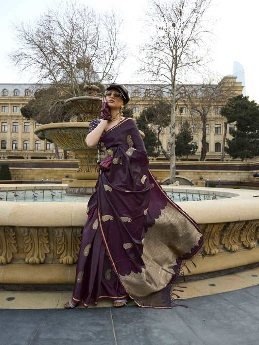 Pure Satin Handloom Weaving Silk Saree with Zari Buti & Heavy Pallu - Maroon Wine