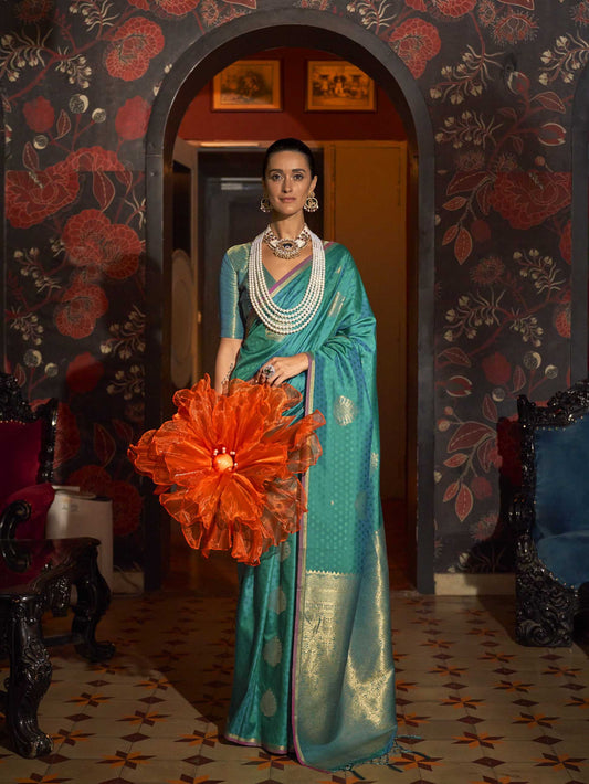 Pure Satin Handloom Weaving Silk Saree with Zari Buti & Heavy Pallu - Deep Peacock Blue