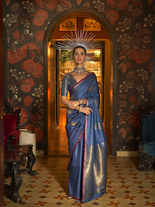 Pure Satin Handloom Weaving Silk Saree with Zari Buti & Heavy Pallu - Blue