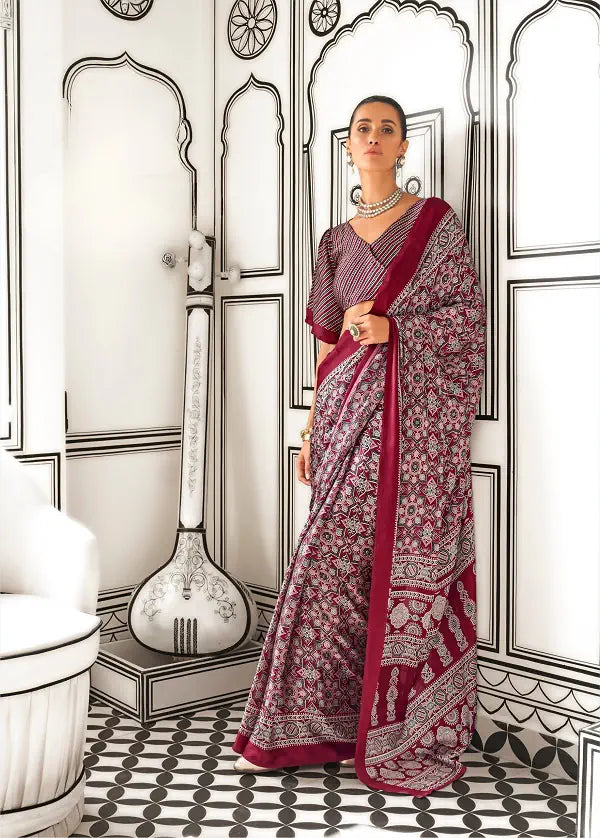 Ajrakh Printed Satin Saree - Red