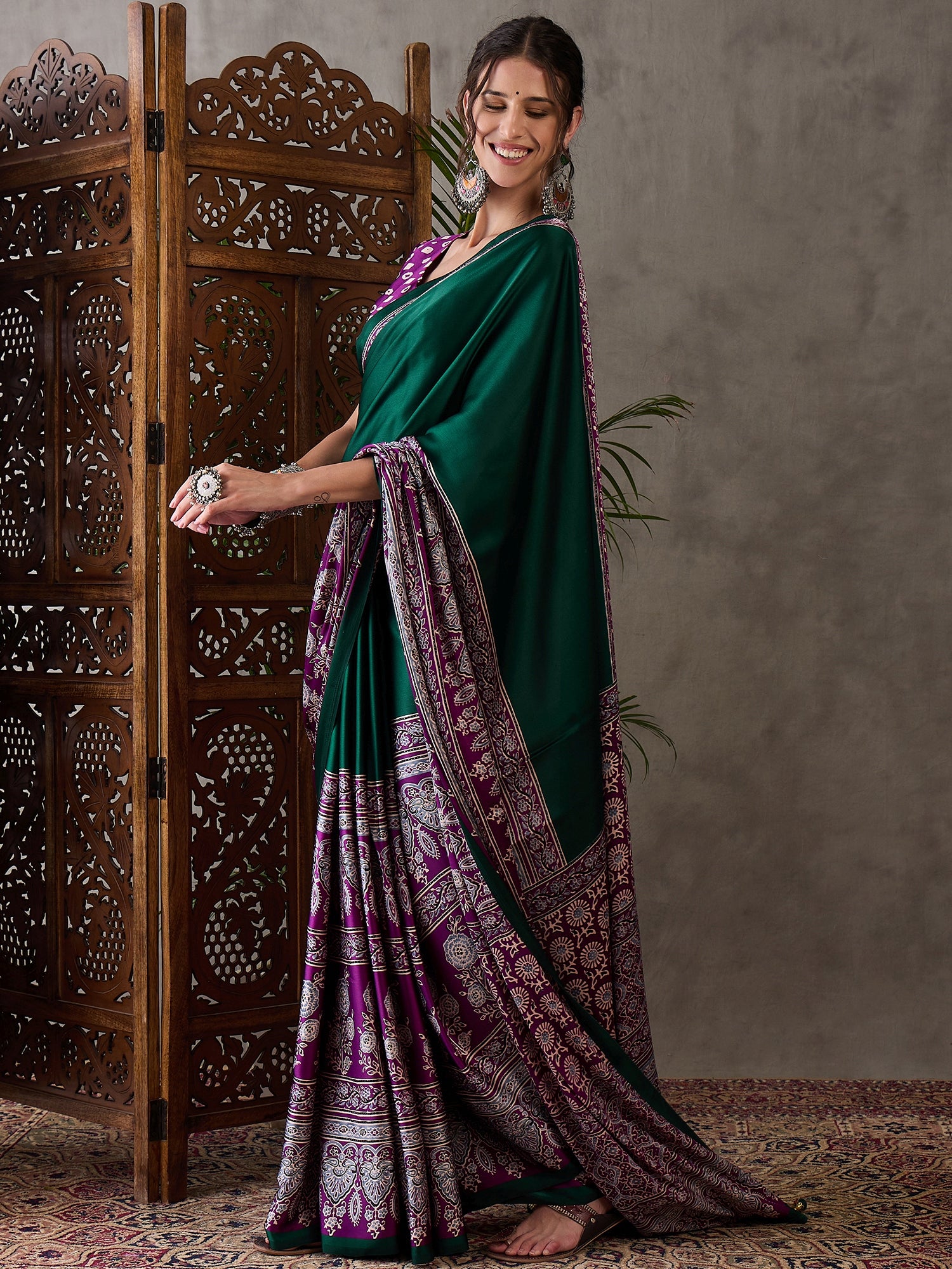 Description: A beautifully crafted saree with fine Ajrakh-inspired motifs that carry a rich traditional charm. The intricate border and highlight add elegance, making it perfect for festive wear or special gatherings.