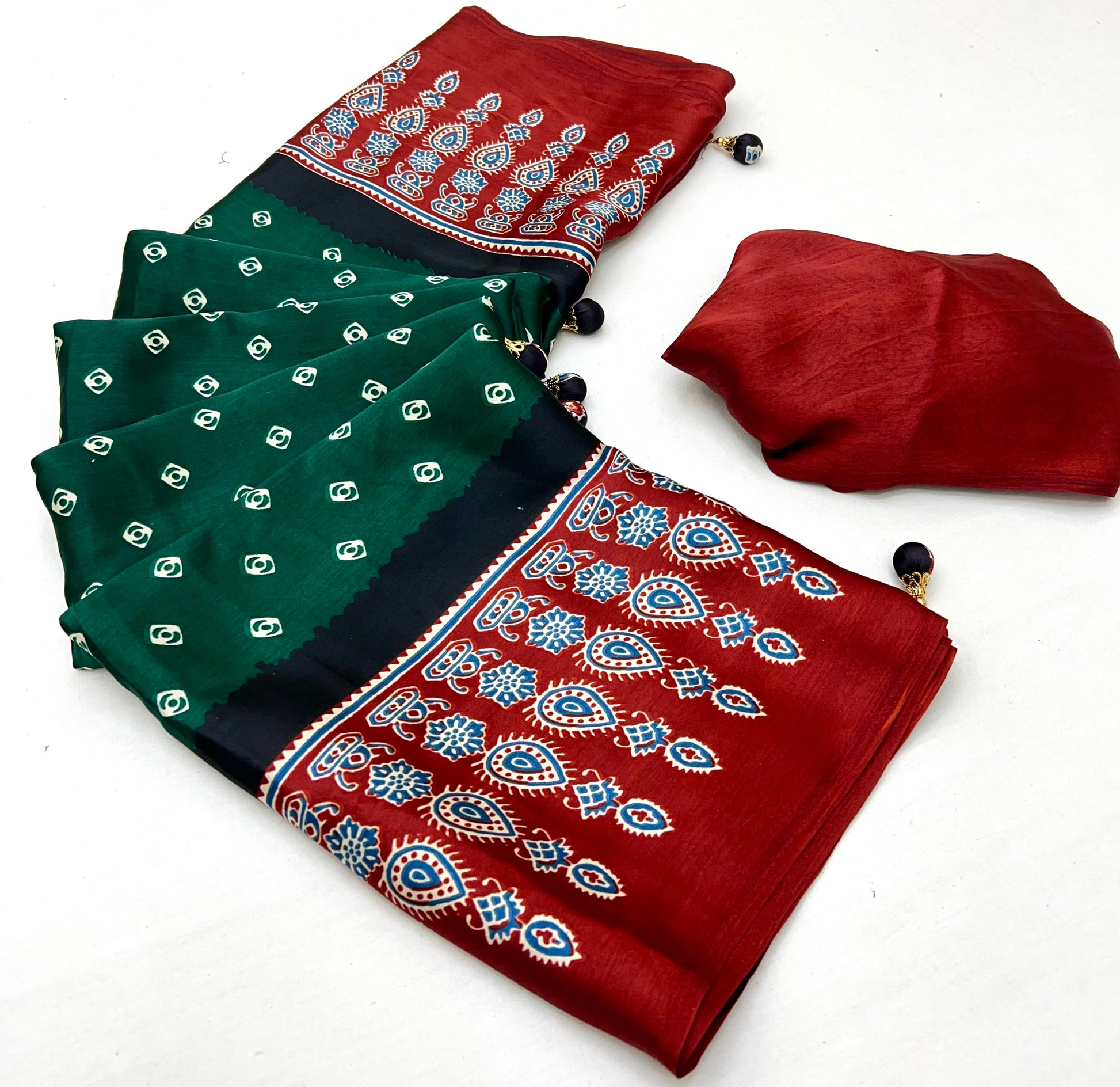 Ajrakh Printed Silk Saree - Green and Red