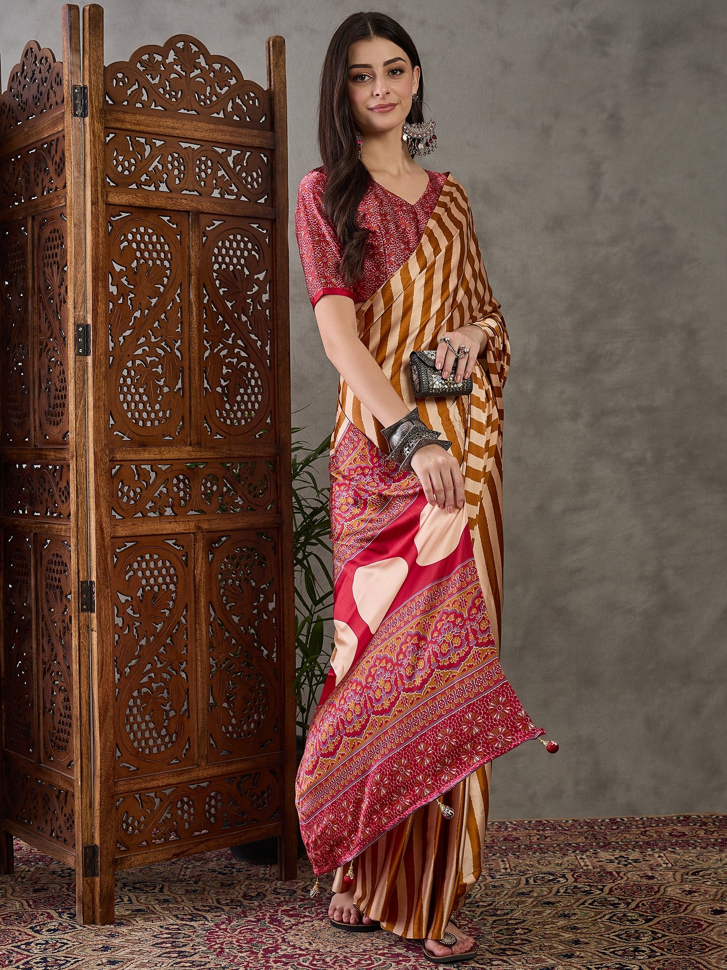 Description: A beautifully crafted saree with fine Ajrakh-inspired motifs that carry a rich traditional charm. The intricate border and highlight add elegance, making it perfect for festive wear or special gatherings.
