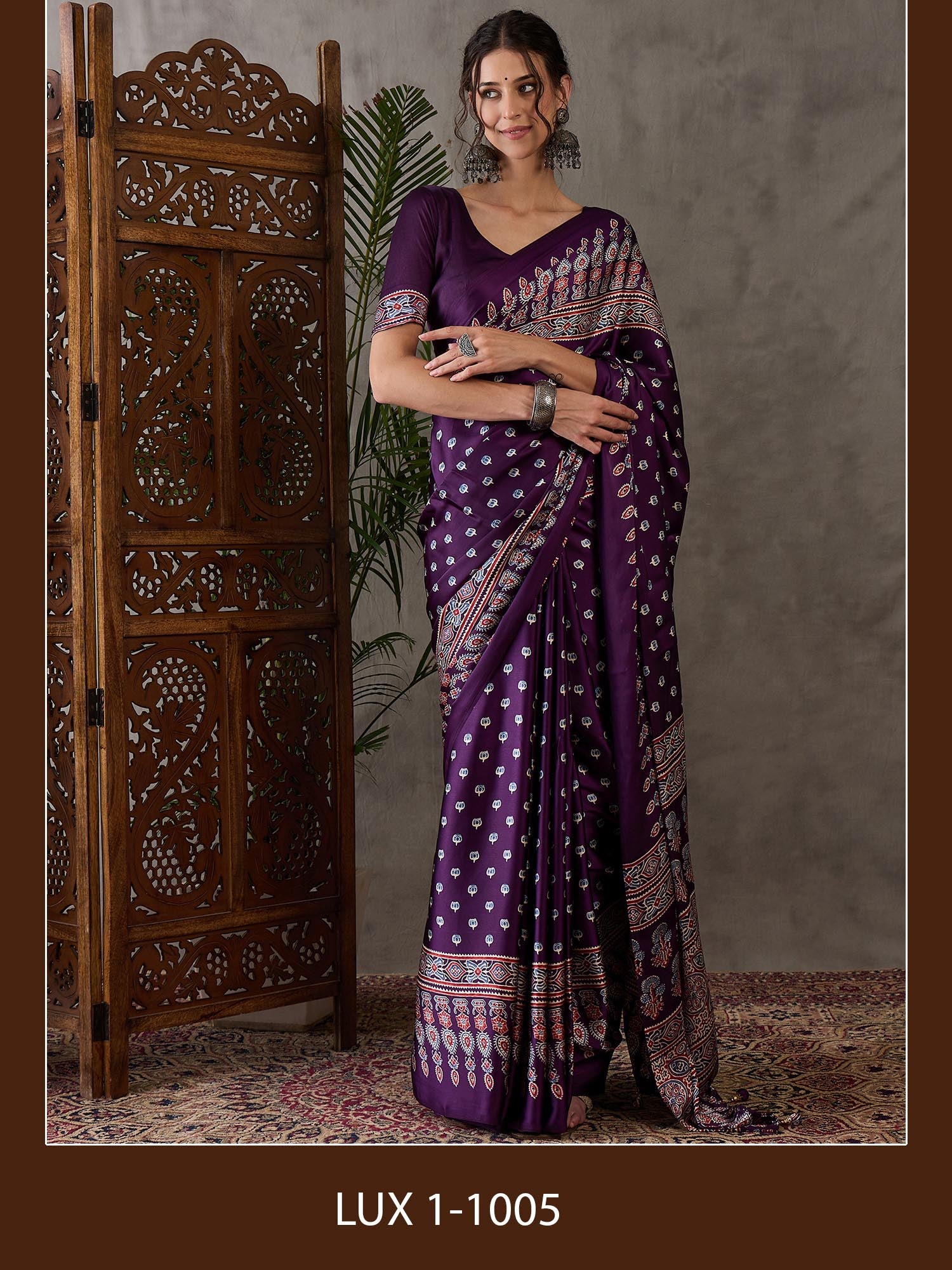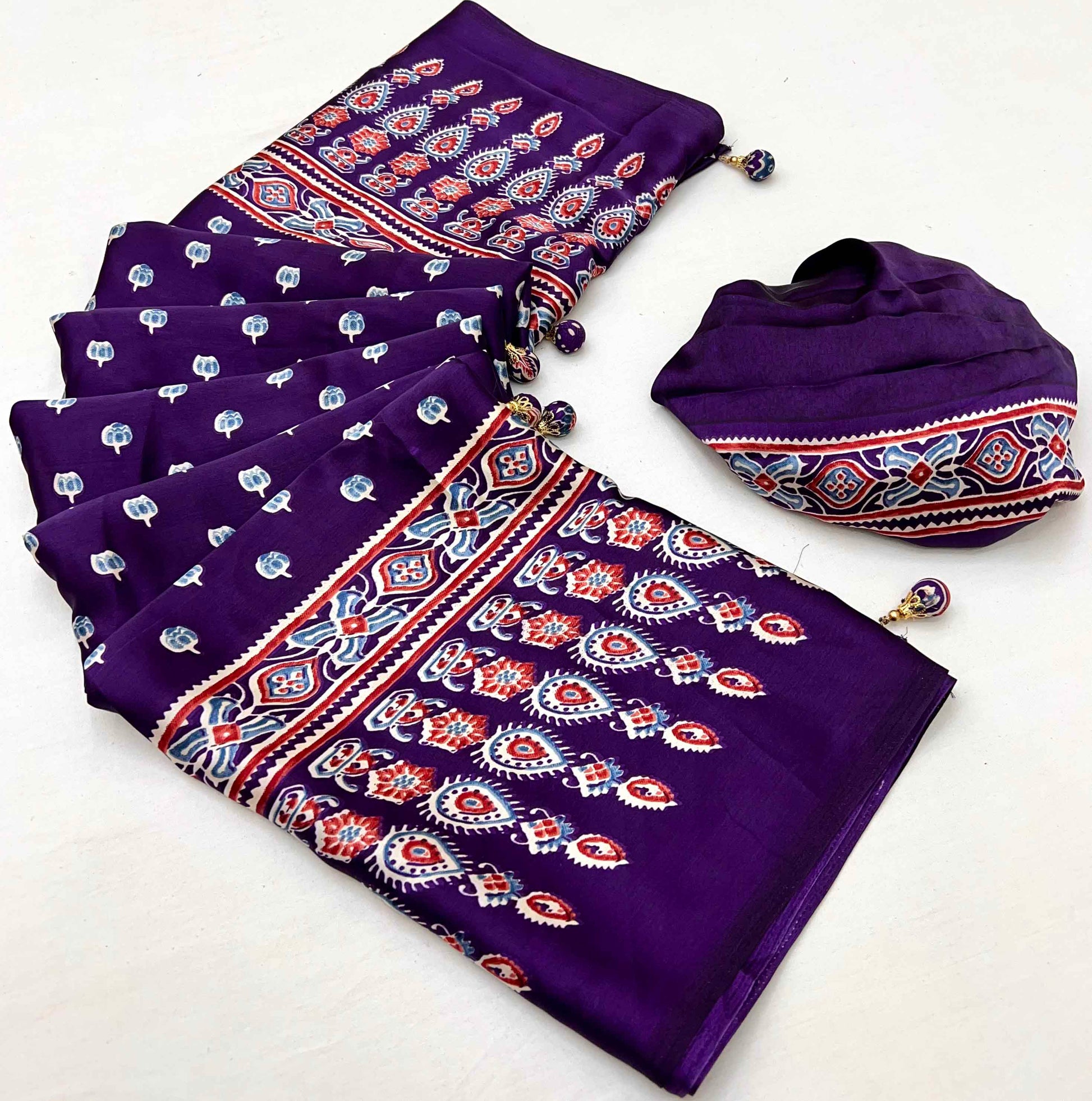 Description: A beautifully crafted saree with fine Ajrakh-inspired motifs that carry a rich traditional charm. The intricate border and highlight add elegance, making it perfect for festive wear or special gatherings.