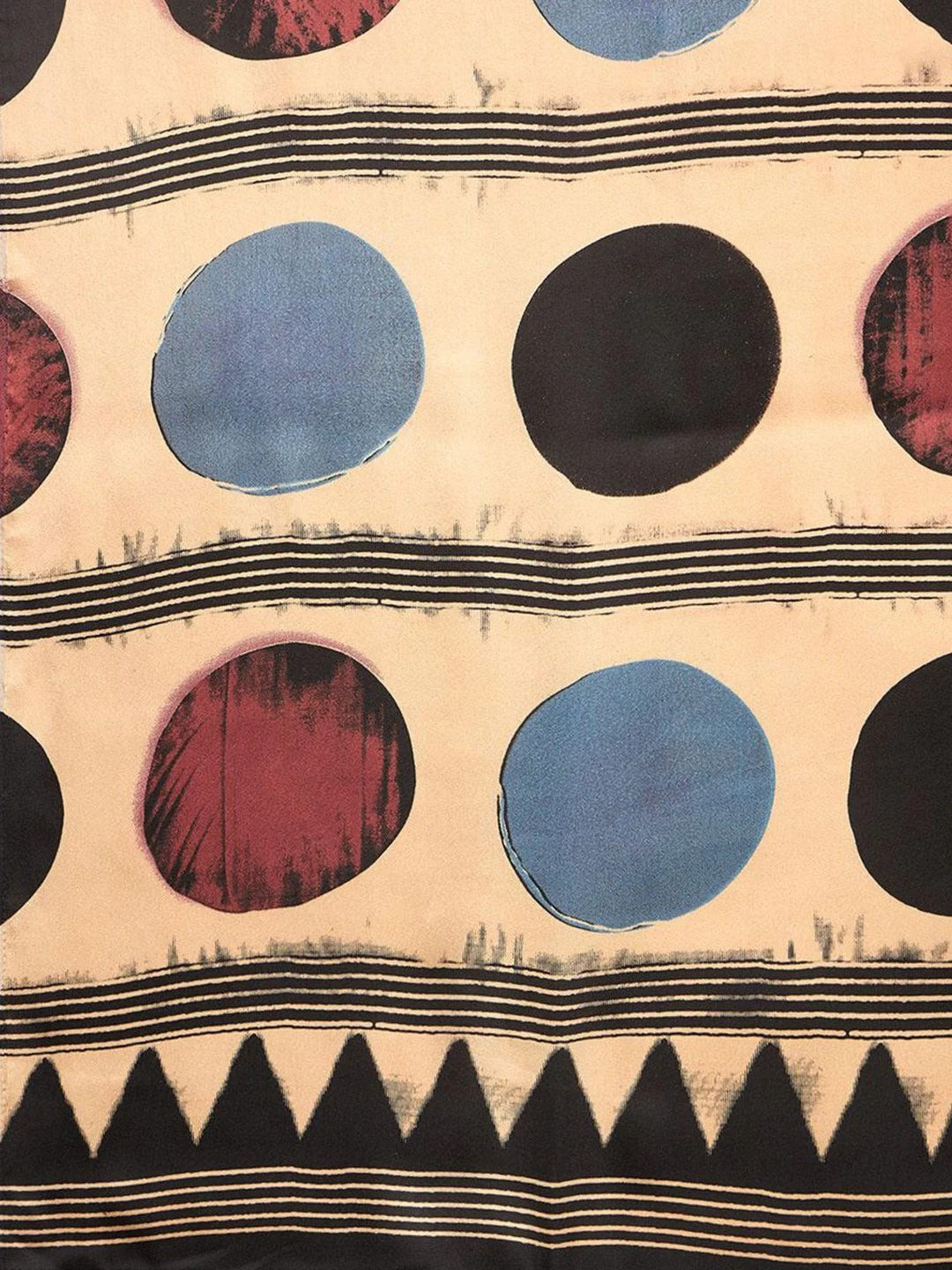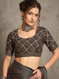 Description: Add a playful twist to tradition with this beige and black Gajji silk saree featuring bold polka dots in indigo, maroon, and black. Luxuriously soft and glossy, it pairs with a back-tie blouse adorned with traditional motifs for a chic fusion look — perfect for festive or artistic occasions.