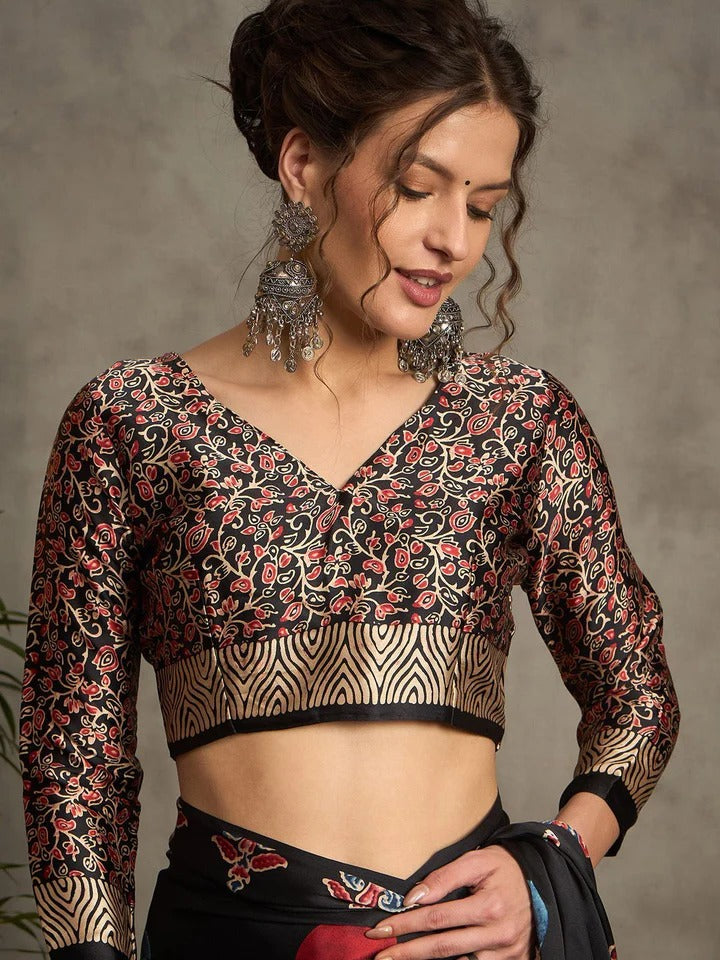 Description: Step into timeless elegance with this black Gajji silk saree, featuring vibrant red-and-blue leaf buta motifs and a golden zari-inspired border. The artistic pallu showcases abstract circular elements in gold, red, and blue for a modern twist. Styled with a printed back-tie blouse, it’s perfect for weddings, festive evenings, and grand celebrations.
