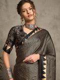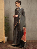 Black Gajji Silk Saree with Tribal Red Geometric Motif & Contrast Bord