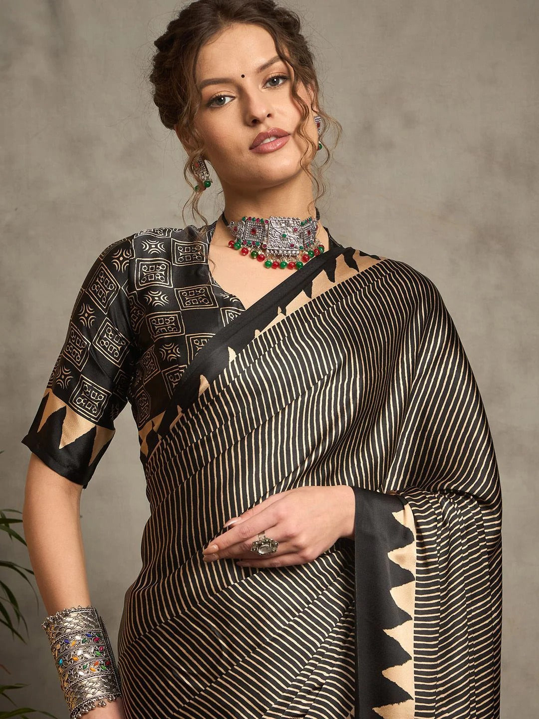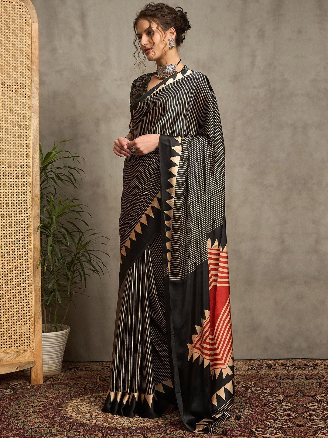 Description: Bold meets heritage in this black Gajji silk saree, featuring a standout red triangle motif and tribal-inspired geometric pallu framed with beige stripes. Paired with a halter-tie tribal-print blouse, it’s perfect for art exhibitions, festive evenings, and cultural soirées.