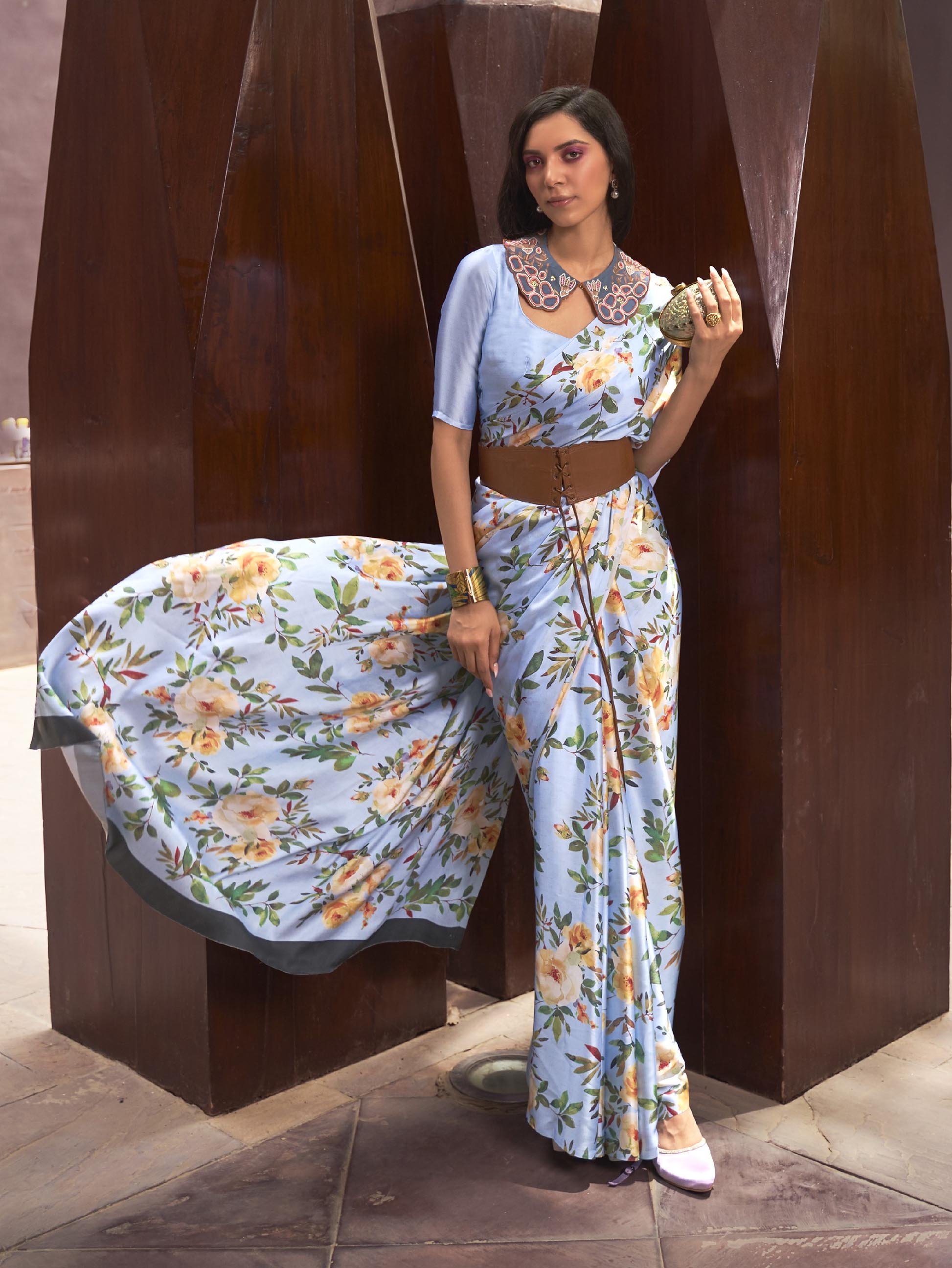 Printed Satin‑Crepe Saree - Sky Blue