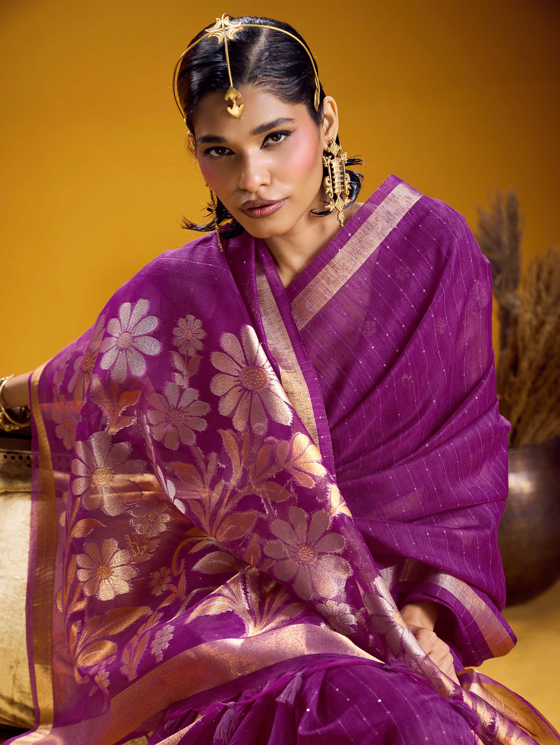 Royal Purple Pure Munga Silk Handloom Saree with Gold Zari Floral Pallu