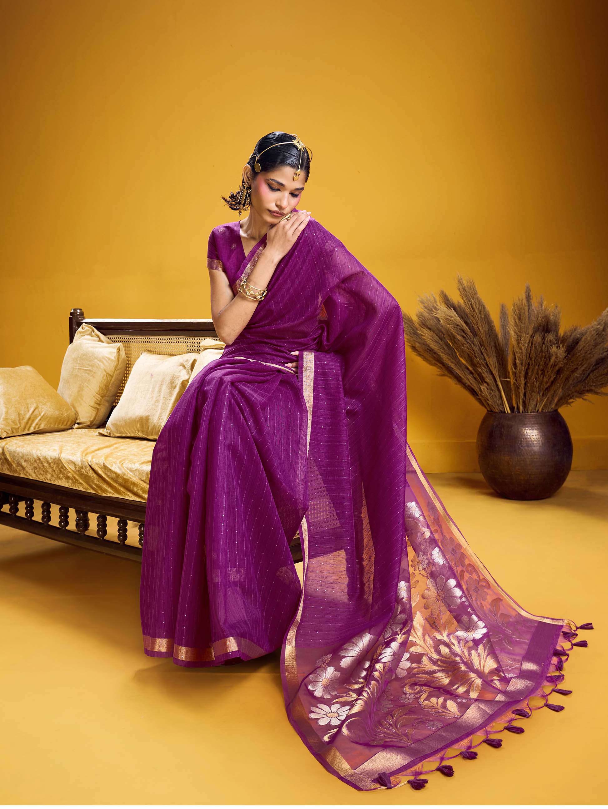 An elegant Royal Purple saree crafted in luxurious Munga silk, beautifully handloom woven with a rich gold zari floral pallu. The intricate craftsmanship and timeless design bring out a regal charm, making it a perfect choice for traditional and festive occasions.