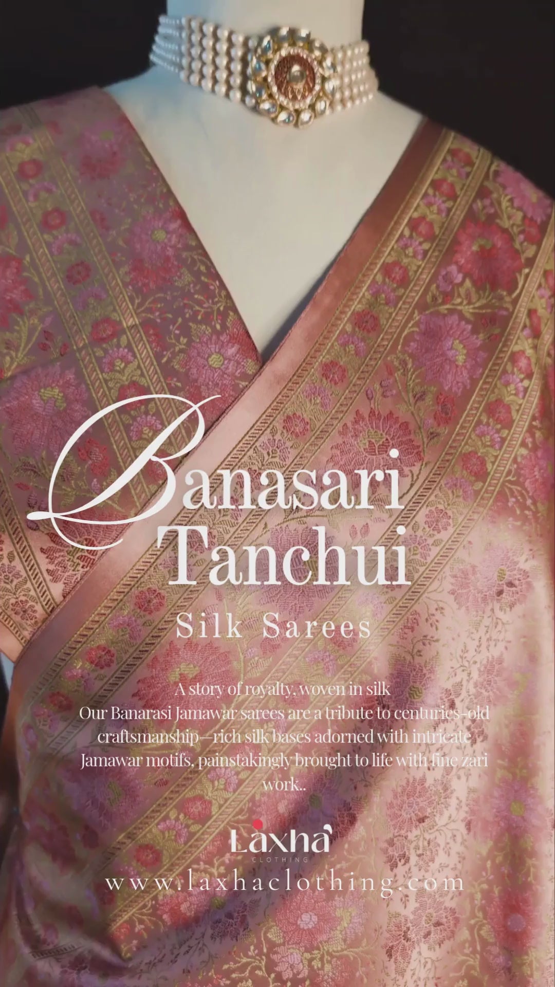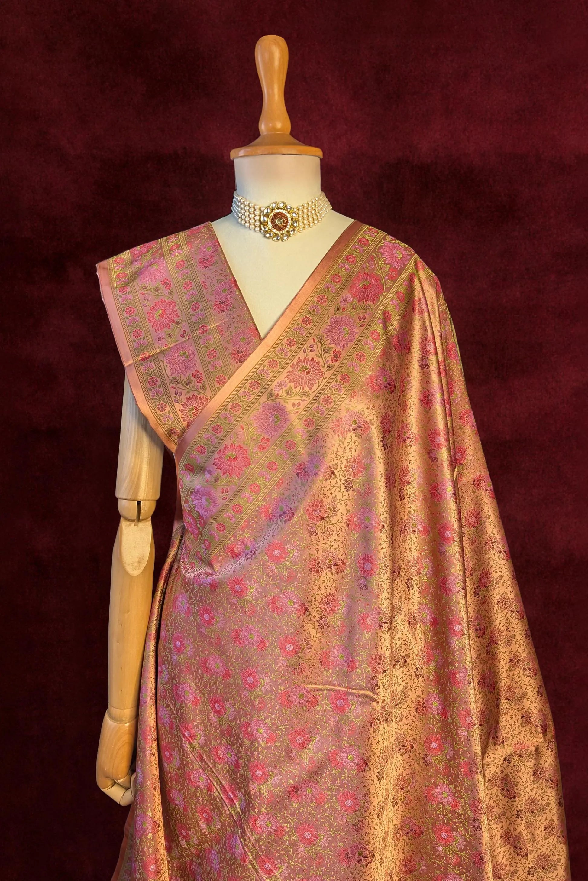 The Banarasi Pure Jamawar Tanchui Saree reflects the timeless artistry of Banaras, brought to life through intricate weaving and rich craftsmanship.