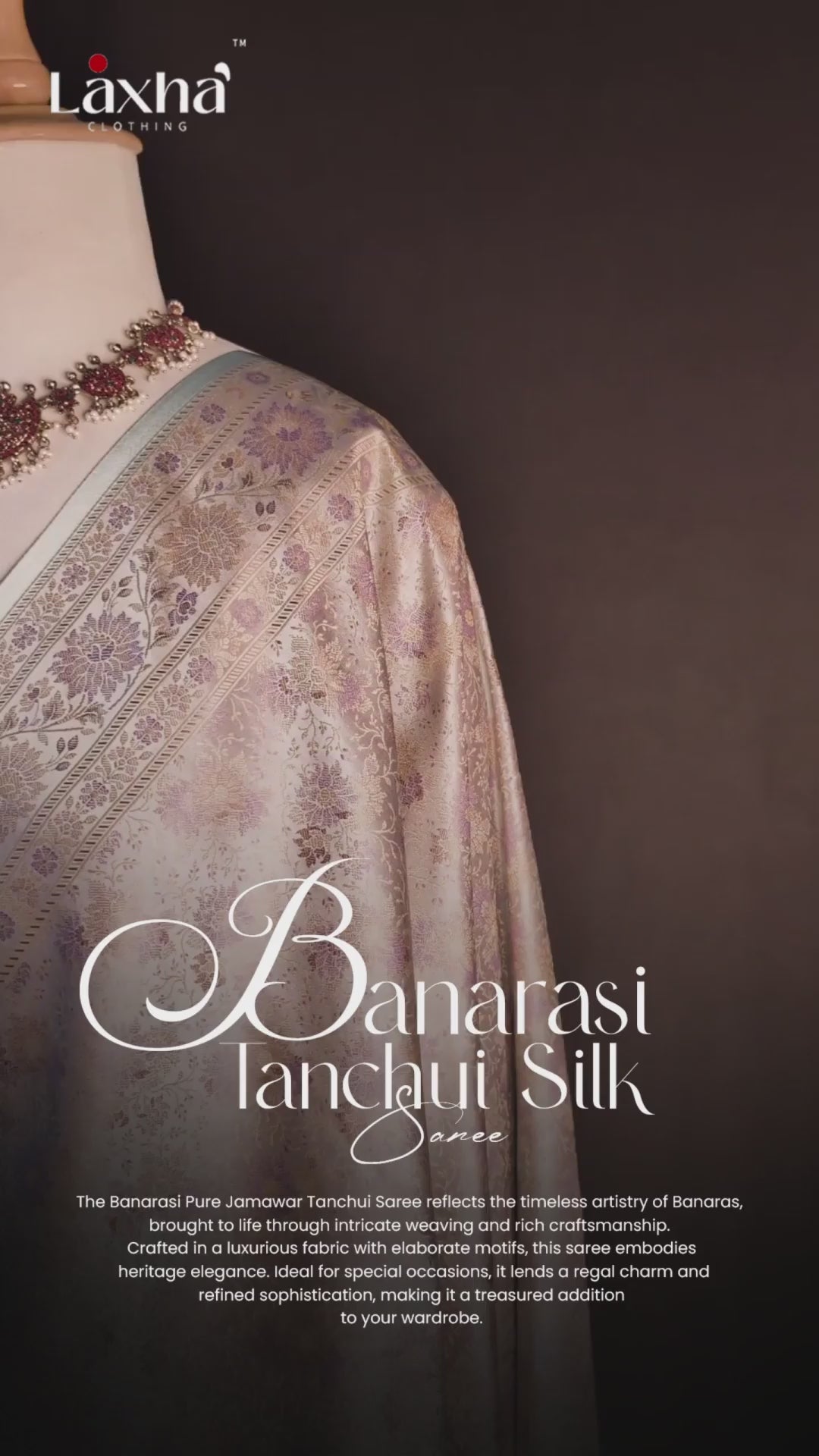 The Banarasi Pure Jamawar Tanchui Saree reflects the timeless artistry of Banaras, brought to life through intricate weaving and rich craftsmanship.