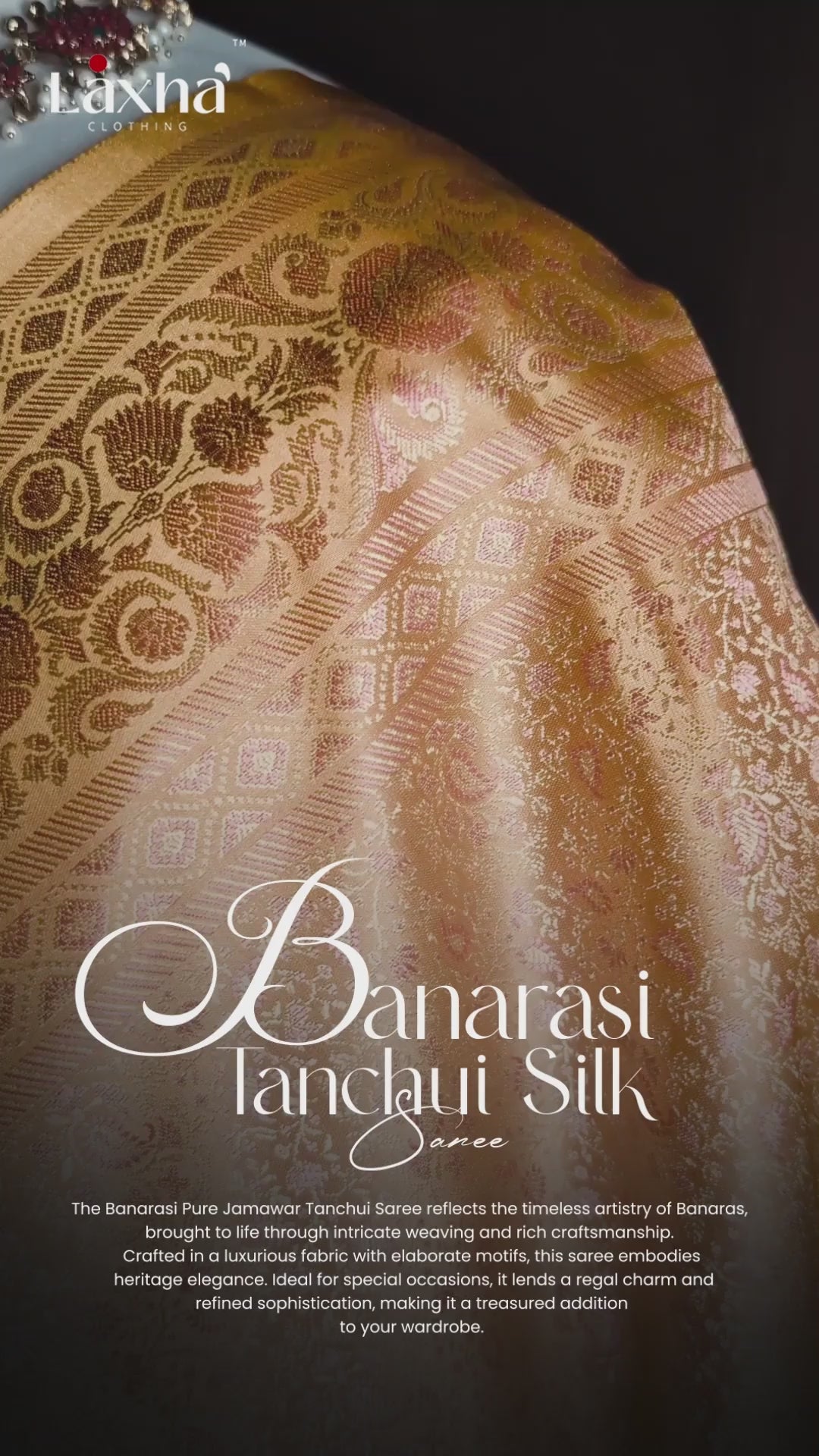 The Banarasi Pure Jamawar Tanchui Saree reflects the timeless artistry of Banaras, brought to life through intricate weaving and rich craftsmanship.
