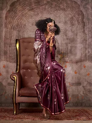 Make a graceful statement with this stunning pure satin handloom silk saree, inspired by traditional Pichhwai art and woven with delicate brocade motifs in fine zari. The smooth satin weave offers a soft, fluid drape and a natural sheen, ensuring comfort during weddings, festivals, or formal gatherings.Complete with a matching brocade blouse piece and ornate zari-woven pallu, it blends timeless artistry with regal elegance.